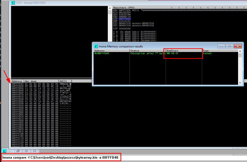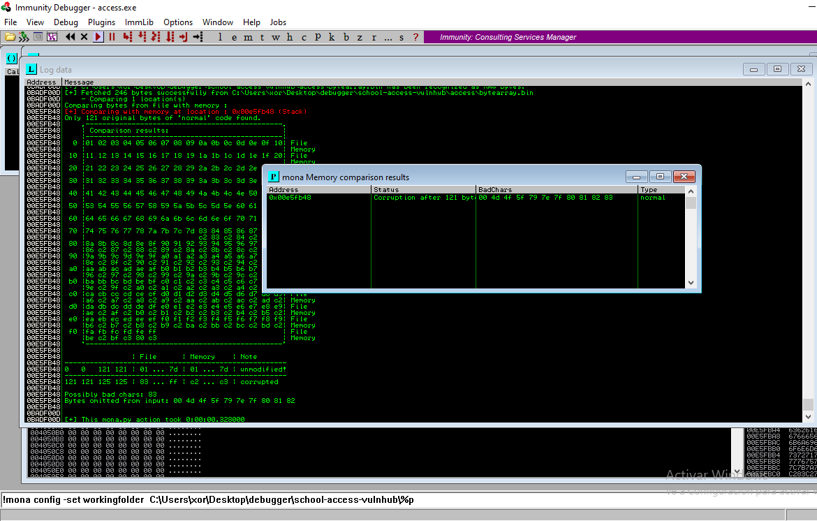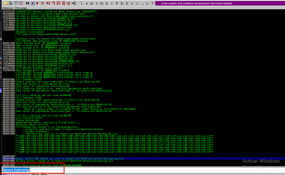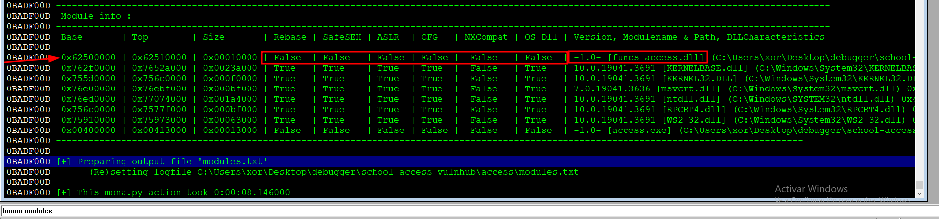 Dicho esto, el Opcode lo debemos de buscar en ciertos módulos que use el binario access.exe Podemos utilizar !mona para listar los modulos: