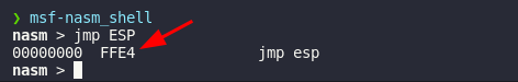 Pero antes con msf-nasm_shell vamos a saber una especie de ID para buscar el OpCode JMP ESP.