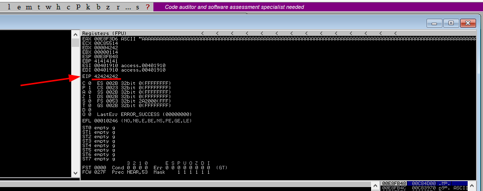 Si bien la idea de tomar el control del registro EIP para apuntar a la pila ESP y ejecutar el shellcode que hemos insertado ahí mismo en la pila, es algo que suena bastante bien. Saltar del registro EIP al ESP solo indicando el valor EIP con la dirección ESP, no funcionará.