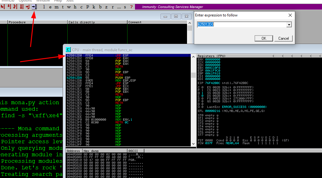 Si buscamos esta dirección en el debugger con el programa corriendo, podemos ver el OpCode y confirmar que es un JMP ESP.