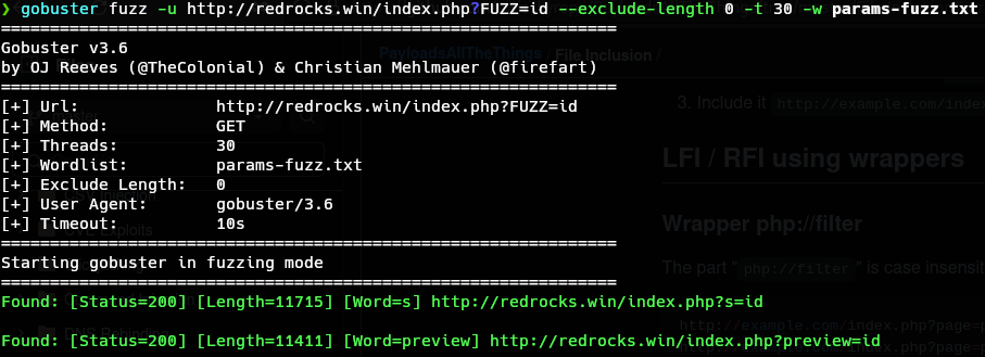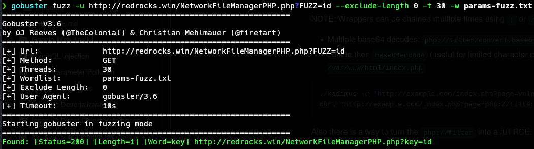 Ajaaa, ya tenemos algunos archivos sospechosos, intuyo que este archivo debe de recibir algún parámetro para ejecutar algún comando o algo así. Así que con otra lista de parámetros comunes que he encontrado en Github, voy a aplicar un fuzz en los dos archivos. Aunque ya os adelanto que NetworkFIleManagerPHP.php es el bueno.