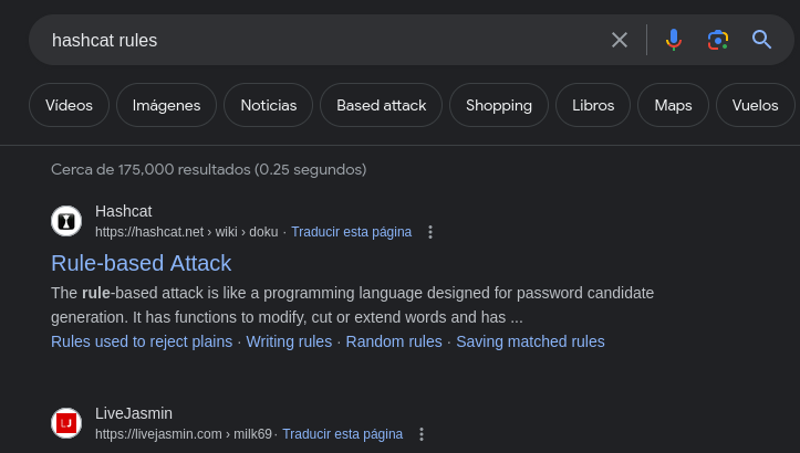 Me hubiera encantado haber realizado esta pequeña investigación, pero mis dedos teclearon otra cosa y di primero con un WriteUP. Aquí es donde me di cuenta de que existía algo como Rule-based attack con HashCat.