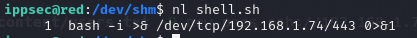 Valla, ahora para evitar que nos quita la conexión, me enviaré una shell reversa desde el directorio /dev/shm que aquí mismo cree un archivo sh.