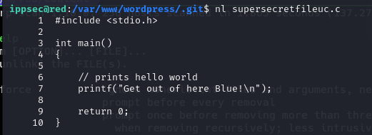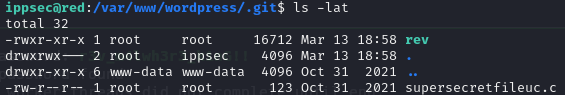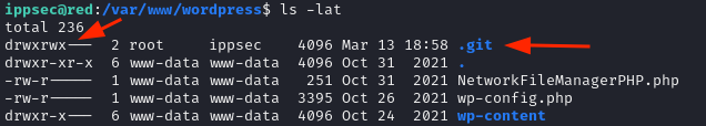 Dentro de la única aplicación web que es el directorio de wordpress está la carpeta .git no era el propietario, pero sí pertenece al grupo ippsec, raro no?